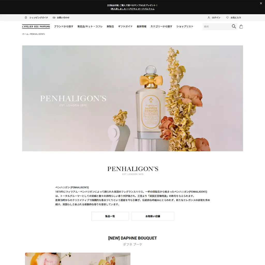 ペンハリガン(PENHALIGON’S)は1870年創業の英国の老舗フレグランスブランドで、日本では「ラトリエ デ パルファム」が正規代理店として公式サイトを運営している。